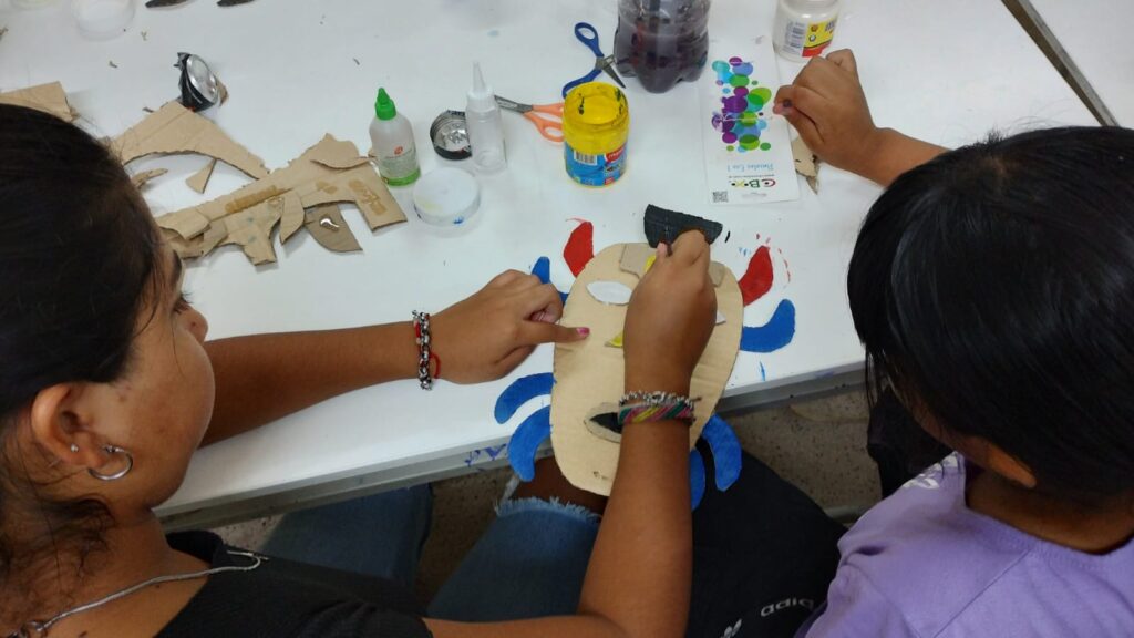 “En la escuela tenemos los Martes de Arte, que es un espacio que habilita la institución con el fin de abrir para las y los alumnos las posibilidades de crear, de conectarse artísticamente, de poder expresar libremente lo que piensan y reforzar nuestra identidad como pueblos originarios. En ese marco, este año llevamos adelante el taller Máscaras Originarias, con la idea de trabajar la identificación”, contó Karina Alonzo, docente originaria de Cacique Pelayo.