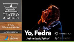Domingo 21 – 18 hs. Ciclo de Teatro: “Yo, Fedra”. Artista: Ingrid Pellicori. Autoría y dirección: Analía Fedra García. «Fedra es un abismo. Un misterio. Una mujer madura que se enamora hasta los huesos, de un hombre joven y prohibido. Fedra susurra retazos de su historia, para todas las personas que la quieran escuchar». Nominada a Mejor Actriz Protagónica Oficial-Premio Martín Fierro 2024.