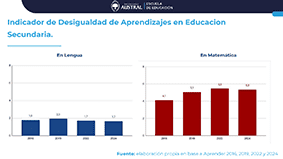 Según el Tercer Informe del Indicador de Desigualdad de Aprendizajes de la Universidad Austral, mientras en Lengua la brecha educativa entre los estudiantes más vulnerables y menos vulnerables se mantiene estable, en Matemática, por el contrario se ha profundizado. Esta situación se da en un contexto de caída sostenida en los niveles de aprendizaje. Apenas 5 de cada 100 estudiantes más vulnerables alcanzan los aprendizajes mínimos en esta materia. En primaria, la desigualdad es menor y se mantuvo relativamente estable en los últimos años.