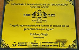 El Intendente Singh celebró y distinguió la trayectoria ininterrumpida de los Parlamentarios Honorarios de la Tercera Edad de Vicente López haciéndoles entrega – a través de la Presidente del Parlamento Lic. Amelia Domec -, de una placa conmemorativa con la siguiente leyenda: “Al Honorable Parlamento de la Tercera Edad de Vicente López, 2000-2025, 25 Aniversario, Legado que trasciende e ilumina el camino de las generaciones que siguen. Kuldeep Singh Intendente”.