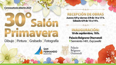 El Municipio de San Fernando, desde su Secretaría de Cultura y Turismo, convoca a artistas de Dibujo, Pintura, Grabado y, por primera vez, Fotografía para participar del prestigioso Salón Primavera, uno de los eventos culturales más importantes en la zona norte del conurbano bonaerense.